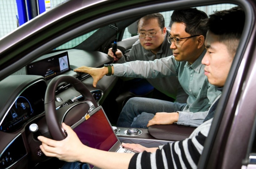 ▲ 현대자동차그룹 연구원들이 ‘커넥티드 카 인공지능 음성인식 기술’을 자동차에서 테스트하고 있다. (사진=현대자동차그룹)