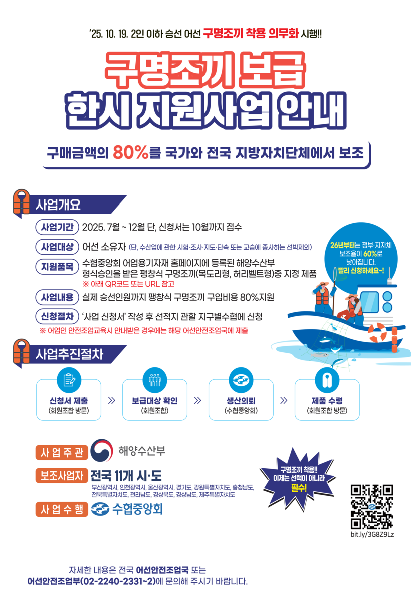 노동진 수협중앙회장은 “이번 구명조끼 지원은 어업인의 생명과 안전을 지키는 매우 중요한 사업”이라며 “또한, 올해만 한시적으로 지원되는 사업인 만큼 많은 어업인이 혜택을 받을 수 있도록 총력을 기울이겠다”고 강조했다.