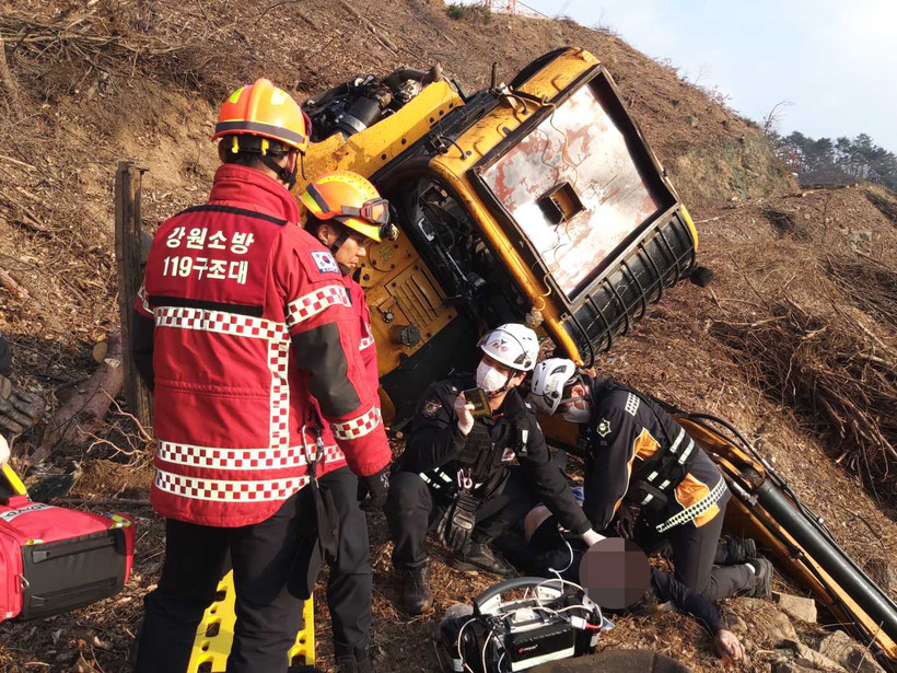 ▲지난해 12월 26일 강원 횡성 갑천면 한 야산에서 포크레인이 전복돼 119 구조대원들이 구조 작업을 벌이고 있다.(사진=강원도소방본부 제공)