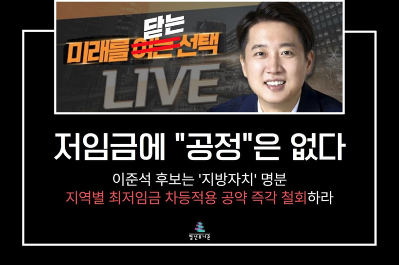 성명 말미에서 청년유니온은 “이준석 후보는 한 줄의 최저임금이 갖는 의미와 ‘진짜 지방자치’가 무엇인지 다시 생각해 보기 바란다”며 “지역 간 격차를 줄이고 어디에 살든 인간다운 삶을 보장할 수 있는 실질적 대안을 제시하라”고 촉구했다.