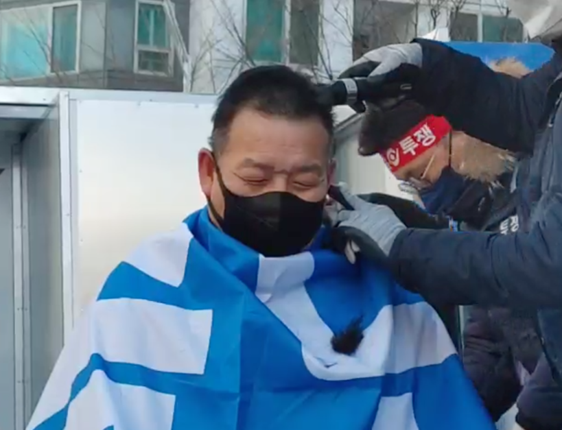 ▲이진헌 삼성웰스토리노조 위원장이 삭발을 단행하며 사측을 향한 강도 높은 투쟁을 예고했다. |