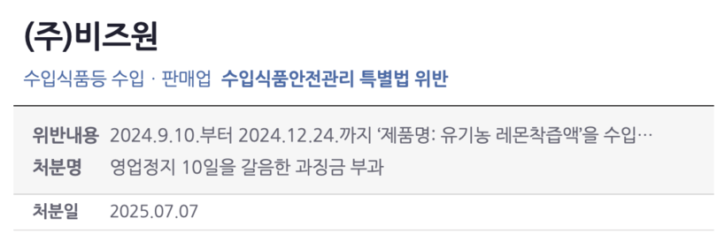 유기농 레몬착즙액 수입신고 허위…부산 수입식품업체 (주)비즈원 과징금 처분