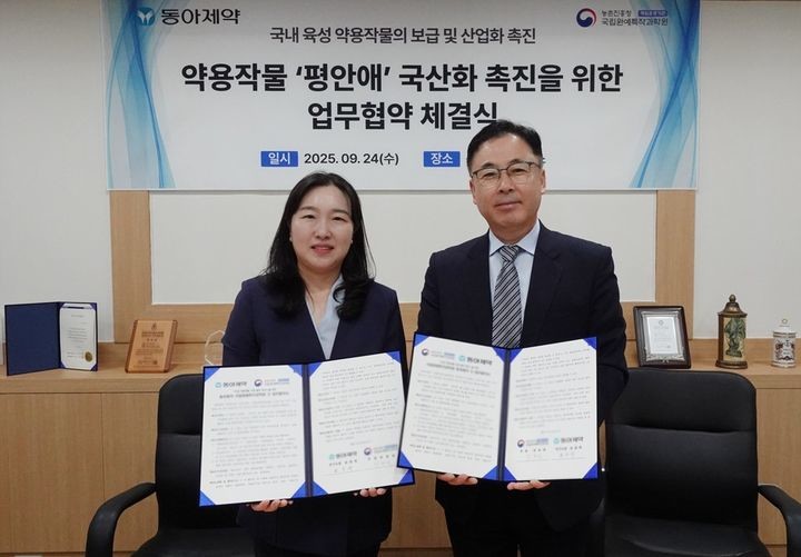 윤춘희 동아제약 연구소장은 “이번 협약을 통해 국산 원료의 안정적 수급과 국산화 품종의 기능성 소재 제품 개발에 속도를 낼 수 있게 됐다”며 “긴밀한 협력을 바탕으로 평안애에 대한 효능 연구에 집중해 차별화된 제품을 선보일 수 있도록 노력하겠다”고 말했다.