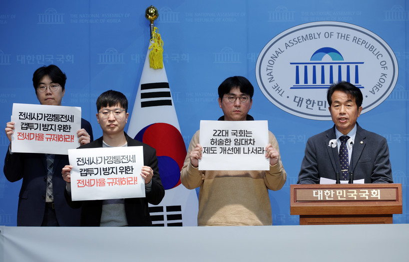 ▲ 주거권네트워크 등 시민단체 회원들이 11월 25일 서울 여의도 국회 소통관에서 전세사기 피해 예방 및 세입자 보호를 위한 주택임대차보호법 개정 촉구 기자회견을 하고 있다. (사진=newsis) |