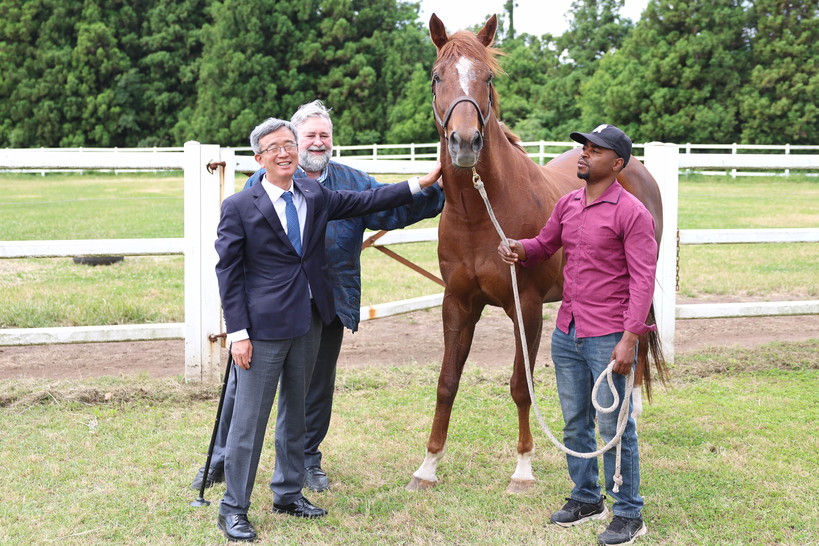 ▲ 명예경주마 선정된 당대불패와 정기환 회장(좌측 앞), 리어던 마이클 조셉 대표(좌측 뒤). (사진=한국마사회 제공) |