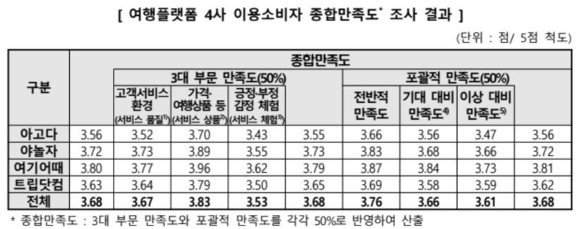 ◇ 여행플랫폼 4사 종합만족도 평균 3.68점...“‘여기어때’가 상대적으로 높아”