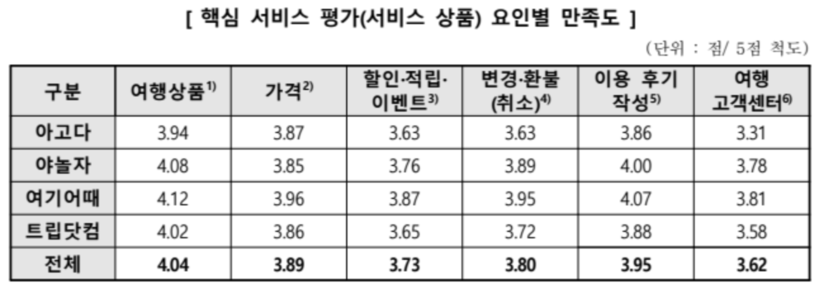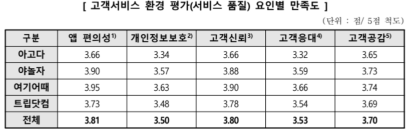 조사 결과 여행상품이나 앱 편의성에 대해서는 만족했지만 고객 접점인 여행고객센터와 개인정보보호에 대해서는 상대적으로 만족도가 낮은 것으로 나타났다.