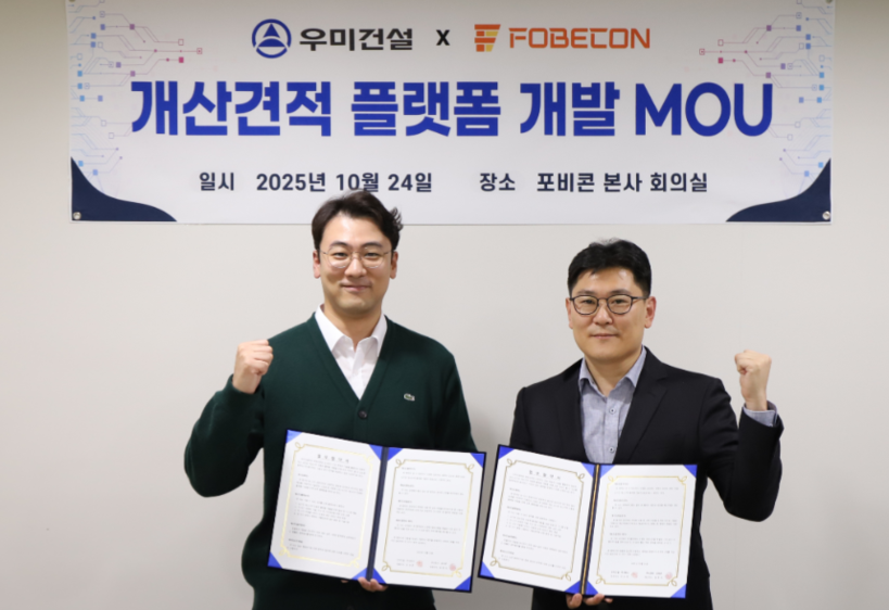 [일요주간 = 이수근 기자] 우미건설이 건설 테크 스타트업 포비콘과 손잡고 공사 개산(槪算) 견적을 자동으로 산출하는 플랫폼 개발에 나선다. 지난 24일 양사는 서울 판교 포비콘 본사에서 업무협약(MOU)을 체결했으며 CAD 도면 입력만으로 원자재 물량과 비용을 자동 계산하는 시스템을 구축할 예정이다.