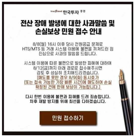 이어 “한국투자증권 홈페이지에 올라온 민원접수 안내문 역시 소극적인 대처로 투자자들에게 실망감을 안겨주었다. 해당 안내문은 ‘8/9 동시호가(또는 접속 가능한 가장 빠른 시간)에 매도해 손실 확정된 건에 한해 보상이 가능하다’고 돼 있다”며 “고객에게 직접 손실 여부를 증명하라고 요구하는 것이다. 게다가 8월 12일까지 접수된 건만 보상하겠다고 해 투자자에게는 고작 4일의 시간이 주어졌다. 해외 체류 중인 투자자는 모르고 넘어갔을 가능성도 있다”고 덧붙였다.