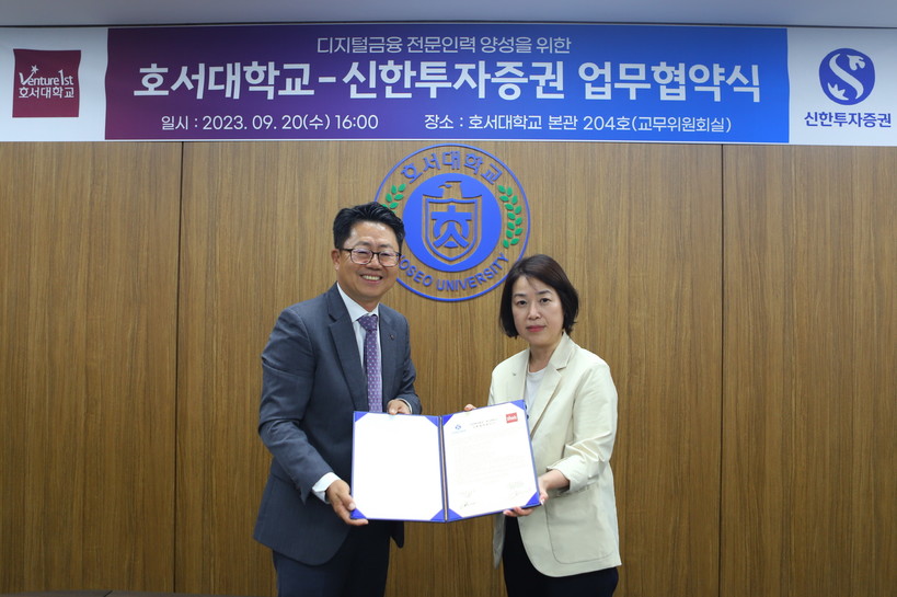 [일요주간 = 김완재 기자] 호서대학교(총장 강일구)가 신한투자증권과 손을 잡고 ‘디지털금융 전문인력 양성’을 위한 산학협력 업무협약을 지난 20일 체결했다.