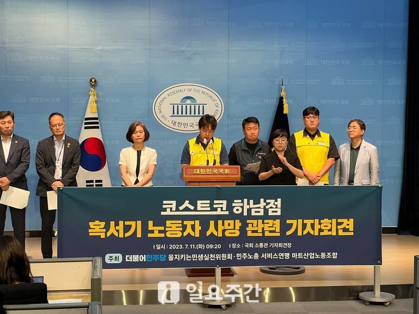 | ▲마트산업노동조합은 지난해 7월 11일 더불어민주당 을지로위원회와 함께 국회 소통관에서 기자회견을 열고 고 김동호 씨의 산재 사망 경위를 밝혔다.(사진=일요주간 DB) |