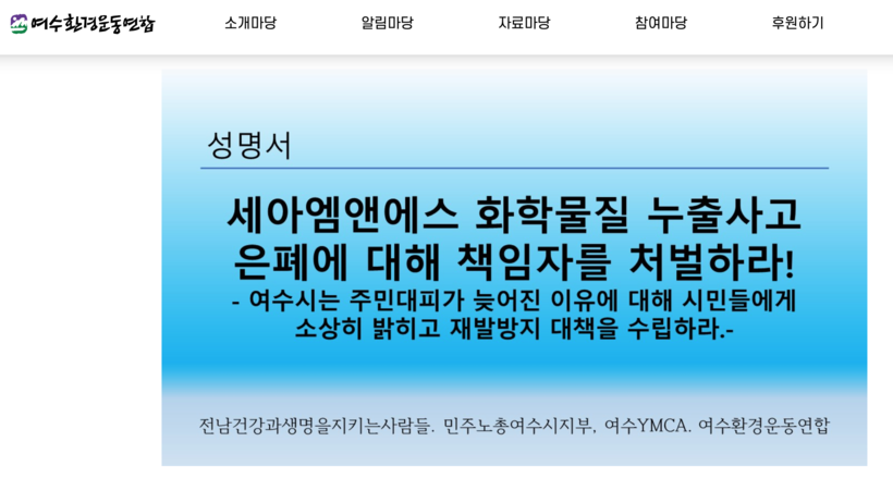 앞서 전남건강과생명을지키는사람들. 민주노총여수시지부, 여수YMCA. 여수환경운동연합은 지난 13일 성명서를 통해 세아M&S 화학물질 누출사고 은폐에 대해 책임자를 처벌을 촉구했다.