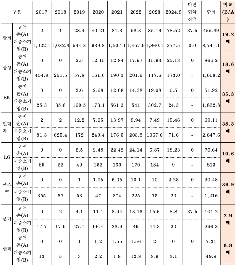 ▲2017~2024.8월까지 연도별, 재계서열 1~9위 그룹별 농어촌상생협력기금 및 대·중소기업상생협력기금 조성 현황(단위 : 억원, %). (자료=윤준병 의원실 제공) |