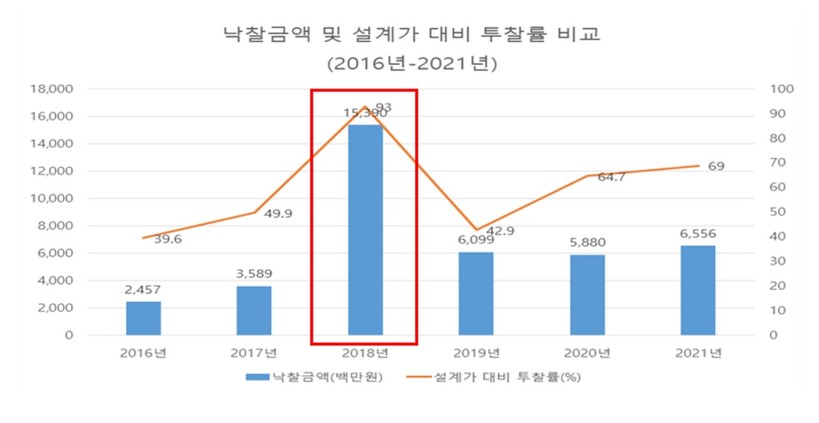 그 결과, KB공동수급체가 낙찰됐다. 낙찰금액은 2017년보다 약 2.5배, 설계가 대비 투찰률은 2017년 57.6%에서 2018년 93.7%로 급격히 상승했다. 이는 LH가 2016년부터 화재보험입찰을 통합해 시행한 이래 낙찰금액과 설계가 대비 투찰률이 가장 높은 것이다.