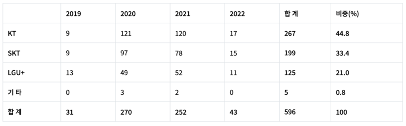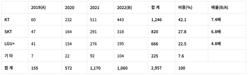 통신분쟁조정 신청현황을 각 통신사별로 2019년과 2022년을 비교하면 KT 7.4배, SKT 6.8배, LGU+ 4.8배로 증가량에서도 KT가 가장 많은 것으로 집계됐다.