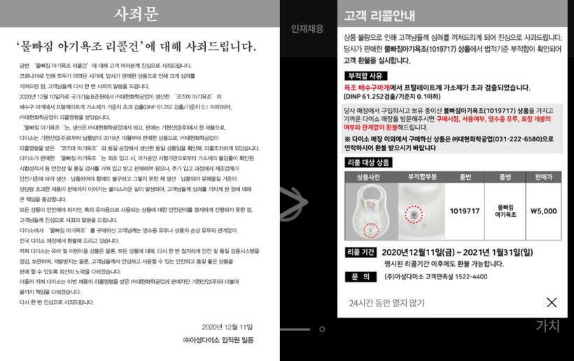 ▲ 2021년 7월 11일 기준치 600배가 넘는 유해성분 검출로 리콜된 '국민 아기욕조' 사건과 관련해 다이소는 홈페이지에 게재한 사죄문과 고객 환불 안내문. (사진=newsis) |