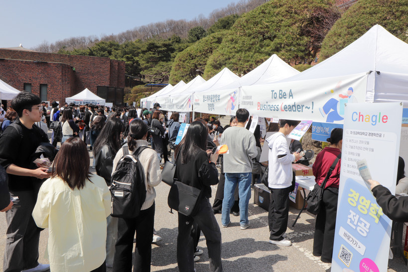 | ▲ 차 의과학대학교 학생회관 앞에 마련된 경영학 전공 부스 앞에서 학생들이 진로 상담을 받기 위해 줄을 서있다.(사진=차병원 제공) |