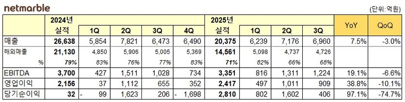 7일 넷마블에 따르면 2025년 3분기 연결기준 매출 6960억 원, 영업이익 909억 원, 당기순이익 406억 원을 기록했다. 매출은 전년 동기 대비 7.5%, 영업이익은 38.8% 증가했다. ‘뱀피르’와 ‘세븐나이츠 리버스’ 등 신작의 흥행이 실적 성장을 견인했으며, 자체 IP 비중 확대에 따른 비용 절감 효과로 영업이익률은 13.1%를 기록했다.