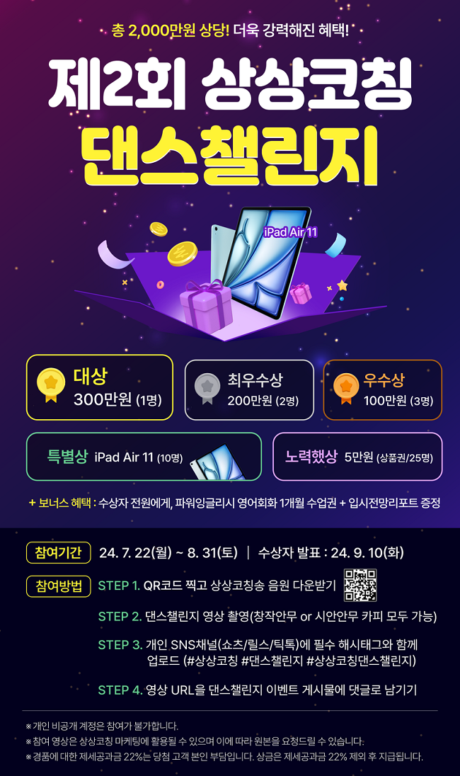 초중고 1대1 코칭교육 전문브랜드인 상상코칭에 따르면 제2회 상상코칭 댄스챌린지는 제1회 댄스챌린지 상금보다 5배 높인 총 2000만 원으로 상금뿐 아니라 특별상으로 아이패드 10대를 포함해 청소년들의 창의적인 참여를 유도할 계획이다.