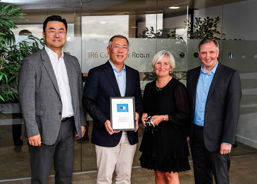 ▲ (왼쪽부터) 김흥수 현대차 부사장, 정의선 현대차그룹 회장, 앤 마리 홈즈(Ann-Marie Holmes) 인텔 반도체 제조그룹 공동 총괄 부사장, 닐 필립(Neil Philip) 인텔 팹24 운영 총괄 부사장이 7일(현지시간) 아일랜드 레익슬립에 위치한 ‘인텔 아일랜드 캠퍼스’ 팹24에서 기념촬영을 하고 있다.(사진=현대자동차그룹 제공)