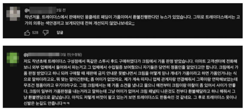 "트레이더스, 2023년 겨울 판매 몽클레르 패딩 가품 논란으로 환불 사태 이후에도 전혀 개선되지 않아"