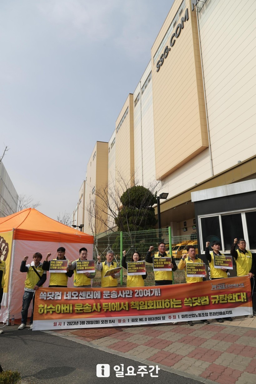 이날 마트노조는 “많은 배송차량들이 있고 운송사가 많이 몰려있는 물류센터의 배송노동자들은 그 정도가 더 심하다”며 “쓱닷컴 NEO센터에는 1000여 명의 배송노동자들이 24시간 돌며 배송업무를 하고 있다”며 “여기에 속한 운송사만 20여 개인데 2차, 3차로 이어지는 계약구조로 인해 배송노동자들의 노동환경은 매우 열악하다”고 주장했다.