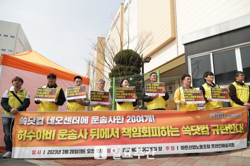 민주노총 서비스연맹 마트산업노조 온라인배송지회(이하 마트노조)는 지난 28일 오전 11시 쓱닷컴 네오센터 앞에서 기자회견을 열고 온라인배송노동자들의 노동환경 개선과 교섭에 쓱닷컴이 나설 것을 촉구했다.