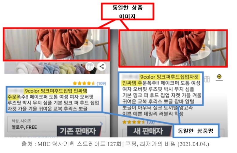 | ▲ 기존판매자의 상품명·상품 이미지를 사용하는 새 판매자(아이템위너). (사진=참여연대) |
