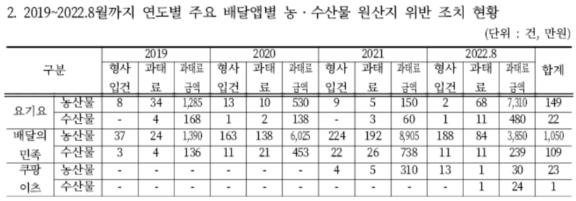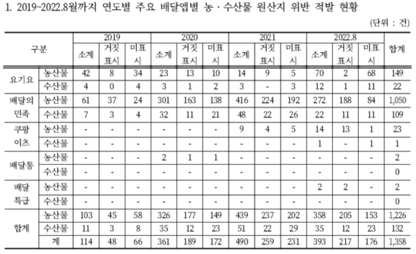 국회 농림축산식품해양수산위원회 소속 더불어민주당 윤준병 의원이 농림축산식품부·해양수산부 등으로부터 제출받은 ‘2019~2022년 현재까지 배달앱별 농·수산물 원산지 표시 위반 적발 현황’에 따르면 2019년 이후 2022년 8월까지 요기요·배달의민족·쿠팡이츠·배달통·배달특급 등 5개 주요 배달앱에서 적발된 농·수산물 원산지 표시 위반건수는 총 1358건이었다.