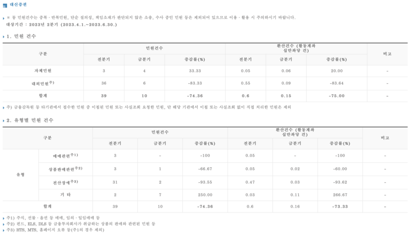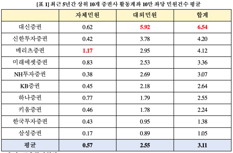 [일요주간 = 김완재 기자] 한 시민단체가 최근 5년 간(2018~2022년) 상위 10개 증권사의 민원건수와 민원비율을 조사한 결과 대신증권이 가장 많은 것으로 나타났다.
