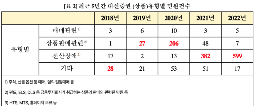 최근 5년 간 대신증권에 제기된 민원을 상품유형별로 살펴보면 전체 1499건 중 ‘전산장애’가 1013건으로 가장 빈발했다.