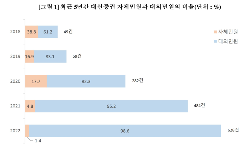 금융소비자는 증권사에 직접 민원을 제기하기도 하지만 금융당국에 민원을 제기하기도 한다. 대신증권의 경우 5년 간 발생한 민원 중 대외민원이 92.6%를 차지해 10대 증권사 중 가장 높은 수치를 기록했다. 대외민원이 자체민원보다 많다면 소비자가 증권사의 문제해결능력을 신뢰하지 않는다는 반증으로도 볼 수 있다는 게 소비자단체의 지적이다.