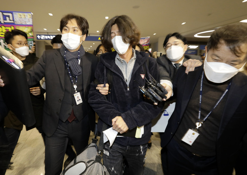 ▲성남 대장동 개발 로비·특혜 의혹의 핵심 인물인 남욱 변호사가 18일 오전 인천국제공항 2터미널에 도착한 후 검찰에 체포돼 공항을 빠져나가고 있다. 천화동인 4호 소유주인 남 변호사는 검찰 수사 전 미국으로 떠났다가 한 달 만에 귀국했다. (공동취재사진=뉴시스) |