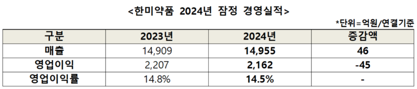 한미약품은 2024년 연결기준 잠정 실적으로 이 같은 매출과 영업이익 2162억 원, 순이익 1435억 원을 기록했다고 4일 공시했다. 매출은 전년 대비 46억 원 증가했고 영업이익과 순이익은 각각 45억 원, 219억 원 감소했다. 특히 영업이익률은 업계 최고 수준인 14.5%에 달했으며 R&D에는 매출의 14.0%에 해당하는 2098억 원을 투입했다.