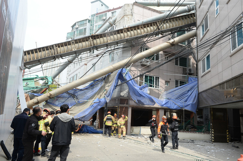 ▲29일 오전 울산 남구의 한 아파트 공사현장에서 지반을 뚫는 대형 중장비인 항타기가 넘어지면서 인근 원룸 건물을 덮치는 사고가 발생했다.(사진=newsis)