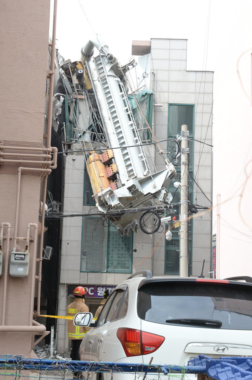 업계에 따르면 29일 오전 11시 35분경 울산 남구 신정동의 아파트 공사 현장에서 37m 높이의 항타기가 넘어지면서 인근 원룸 건물 3개 동을 덮쳤다.