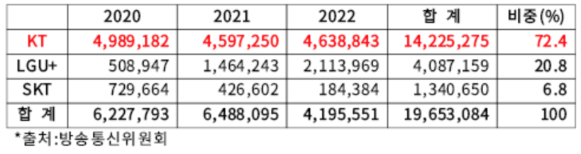 최근 3년 간 스팸발송 현황을 살펴보면 총 3549만 8314건 중 KT 1422만 5275건(40.1%), 다우기술 874만 5871건(24.6%)등의 순으로 나타났으며 이중 KT가 전체 스팸 발송 건수 중 40.1%로 가장 많았다.