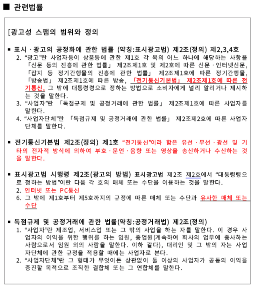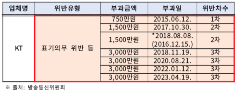 KT가 방송통신위원회로부터 스팸 전송과 관련해 과태료 처분을 받은 것은 정보통신망법 제50조 제4항에 따른 전송자의 명칭 및 연락처 등을 문자에 표기하지 않은 ’표기의무 위반‘ 때문이며 이러한 KT의 반복적인 불법스팸 전송행위는 정보통신망법에 근거할 경우 과태료 처분만을 받게 된다.