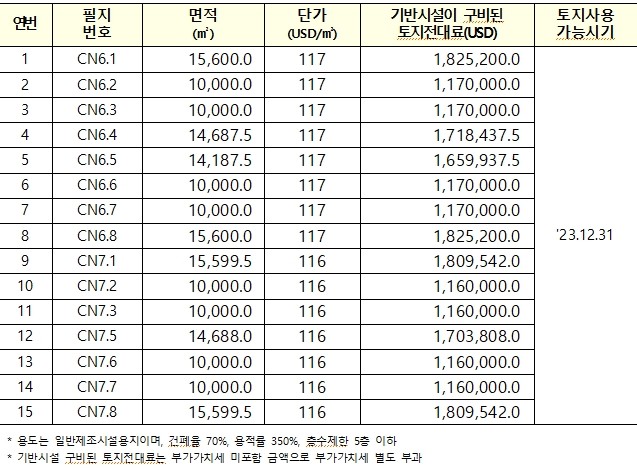필지별 면적은 10,000㎡∼15,600㎡이며, 공급가격은 ㎡당 USD 116∼117, 베트남 토지법에 따른 토지사용기간은 2071년 7월 6일까지다.