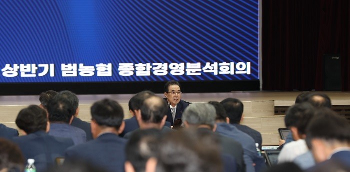 이성희 회장 주관으로 서울 중구 농협중앙회 본관에서 진행된 이날 회의에는 중앙회 임원, 계열사 CEO, 집행간부, 지역본부장, 부실장 등 300여 명이 참석했으며 ▲상반기 경영실적 점검 및 재무성과 평가 ▲부문별 경쟁력 강화 방안 ▲식품R&D통합오피스 등 통합조직 사업추진방향 ▲하반기 정책·경제 전망 및 대응 전략 등을 논의했다.