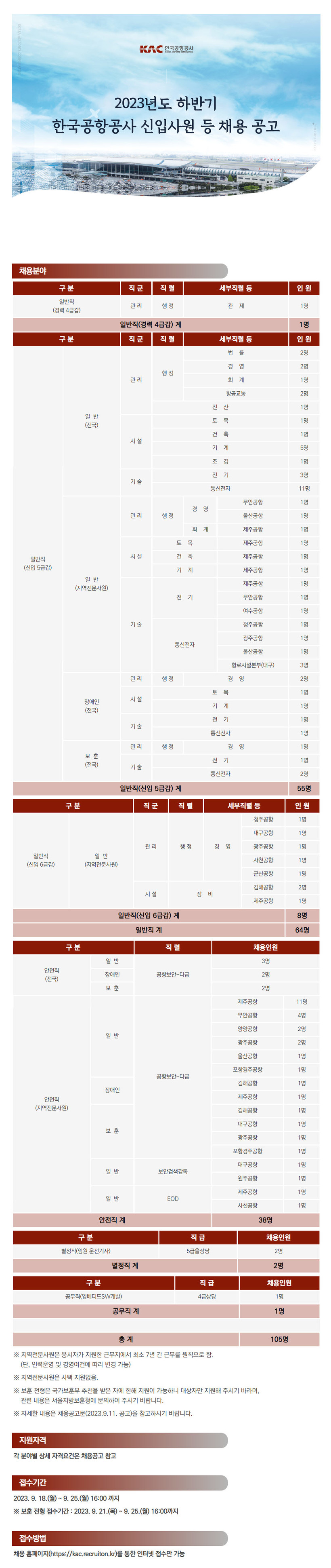 모집분야는 행정·시설·기술·안전직 등 18개 분야로 일반직 64명, 공항보안 34명, 보안검색감독 2명, EDO 2명, 별정직 2명, 공무직 1명 등 총 105명이며, 사회형평분야 채용을 위한 장애인과 국가보훈대상자 전형을 별도 실시한다.