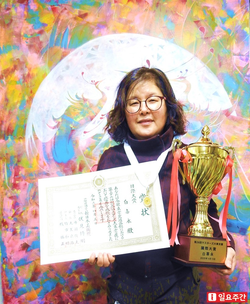 ▲ 제26회 마스터즈 大동경전에서 국제대상을 받은 백희영 화백 |