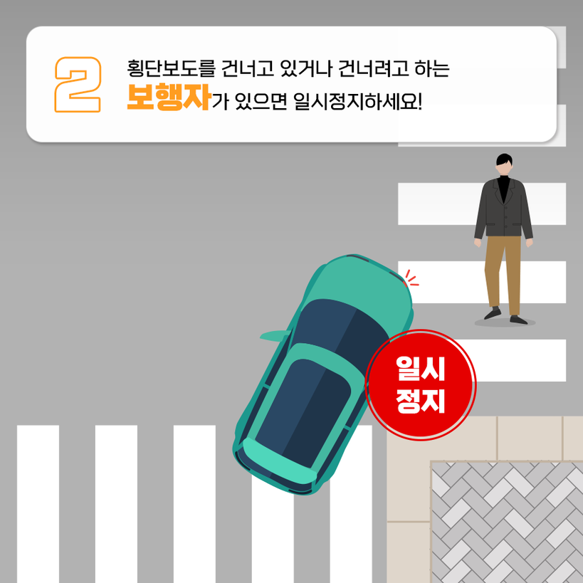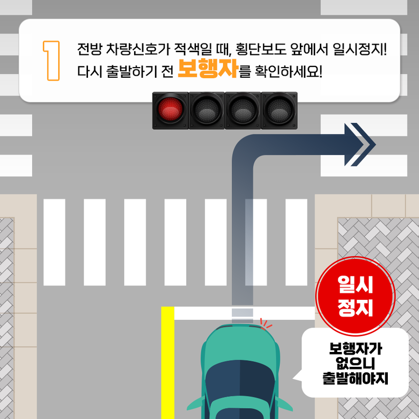 카드뉴스가 설명하는 상황은 크게 3가지다. ▲전방 차량신호가 적색일 때에는 횡단보도 앞에서 우선 정지하고, 다시 출발할 때에는 ‘보행자’ 유무에 따라 판단해야 한다. ▲우회전 중에 횡단보도를 건너고 있거나 건너려고 하는 ‘보행자’가 확인되면 반드시 일시정지해야 한다. ▲이후 ‘보행자’가 횡단보도를 다 건넌 것을 확인했다면 서행하여 통과하면 된다.