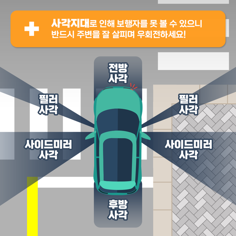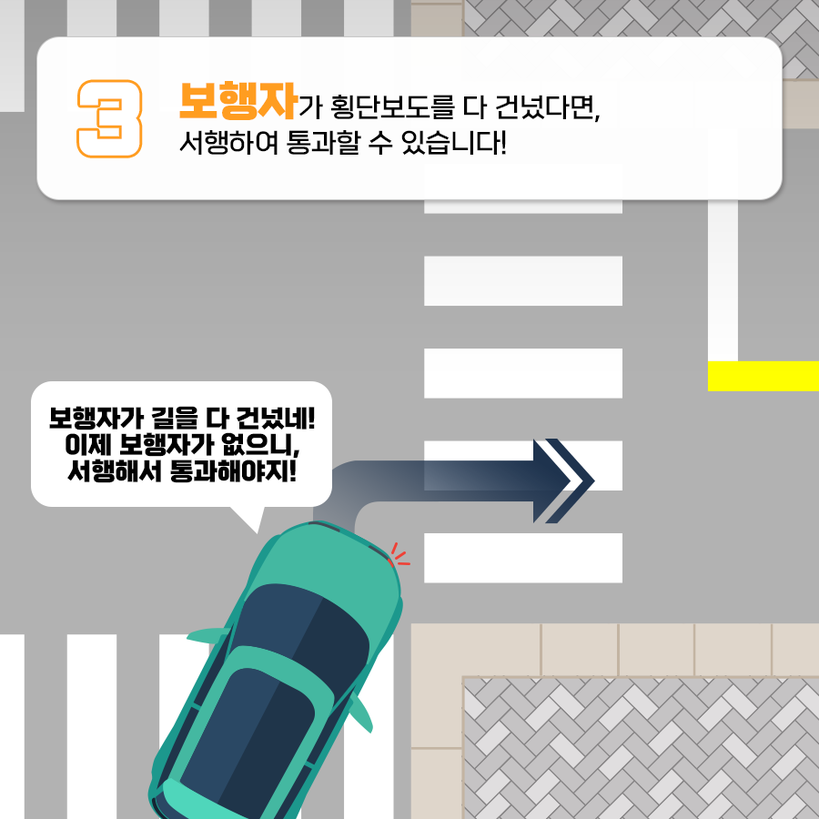 우회전 시 횡단보도에서 보행 신호가 녹색이더라도 보행자가 없는 것이 확인되면 서행하면서 통과할 수 있으나, 사각지대로 인해 미처 확인하지 못한 보행자가 있을 수 있기 때문에 각별히 주의해야 한다.