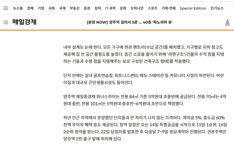 앞서 지난 4월 11일 양주역 제일풍경채 위너스카이 견본주택 개관 당시 초역세권 입지와 합리적인 분양가 그리고 소음 저감 효과가 큰 라멘구조 도입 등을 내세워 대대적인 홍보를 진행했다. 주요 언론 보도에서도 ‘라멘구조’가 강조되며 분양 열기를 끌어올렸다.