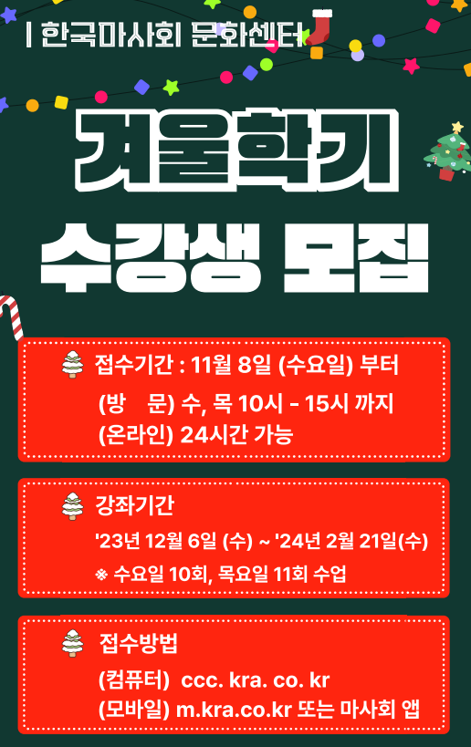 이번 겨울학기는 오는 12월 6일부터 매주 수, 목요일에 10~11주간 진행될 예정이다.