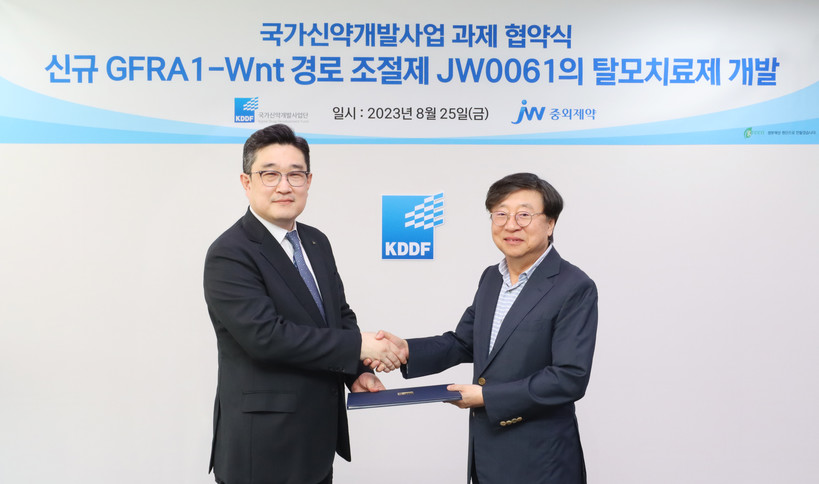 [일요주간 = 이수근 기자] JW중외제약(대표 신영섭)은 Wnt 표적 탈모치료제 ‘JW0061’이 1차 국가신약개발사업’ 지원 과제로 선정돼 국가신약개발사업단(단장 묵현상)과 연구개발(R&D) 협약을 체결했다고 28일 밝혔다.
