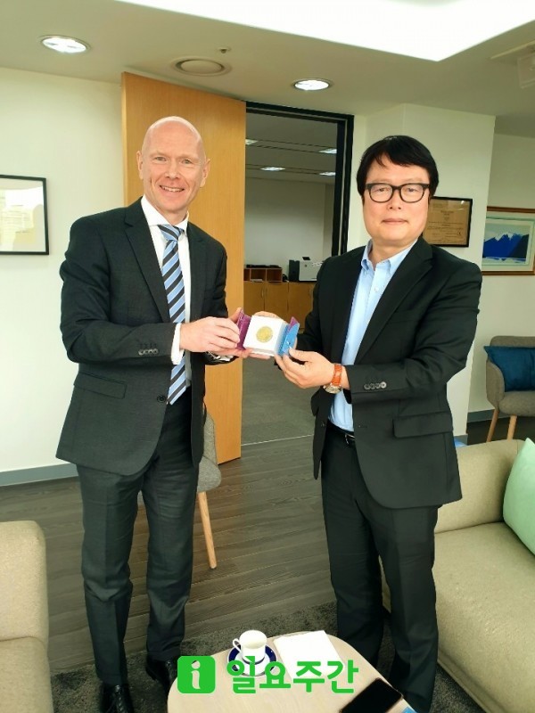 ▲ ‘프로데술베르그’(Frode Solberg) 노르웨이 대사와 인터뷰를 마치고 기념 촬영.(2020.05.29) |