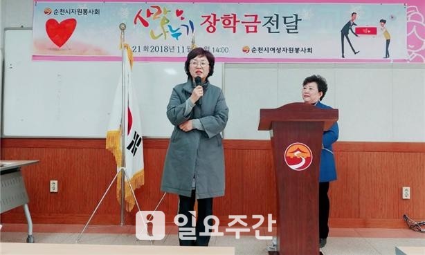 ▲ 사랑나누기 장학금 전달하는 선순례 씨 |