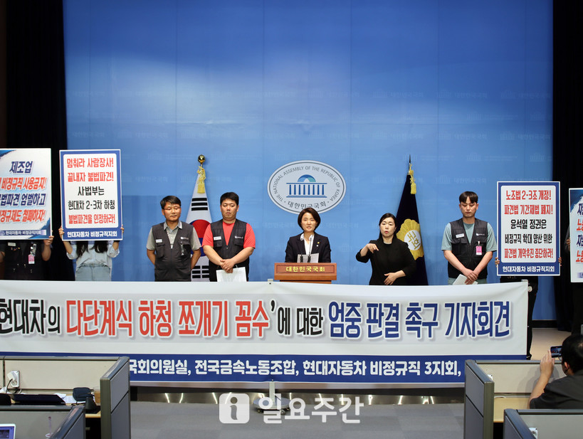 이와 관련 정의당 이은주 의원, 전국금속노동조합, 현대자동차비정규직지회 3개 지회(울산, 전주, 아산) 주최로 22일 국회 소통관에서 기자회견을 열고 현대차가 불법파견을 감추기 위해 만들어 낸 ‘하청노동 쪼개기’를 규탄하고 사법부를 향해서는 제조업 내 다단계 하청을 통한 현대차의 불법파견 엄단을 촉구했다.